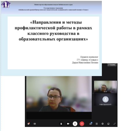 23 апреля педагог-психолог ГУ «Центр «Семья»»Д.Н. Петина выступила с лекцией для классных руководителей Борзинского района (по приглашению ГУ ДПО «ИРО Забайкальского края»). В ходе встречи обсудили тему «Направления и методы профилактической работы классных руководителей в образовательной организации».